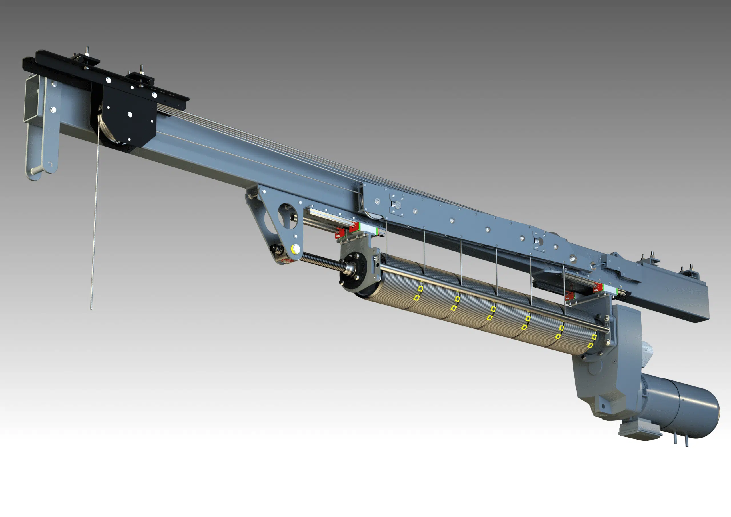 · High-end general purpose fly bar hoist with moving drum and headblocks assembly.